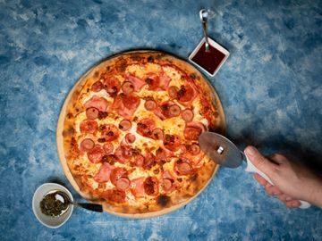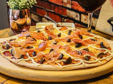 ¡Viene con todo! Chorizo horneado, pepperoni, jamón de pierna, hongos, pimiento morrón y cebolla morada